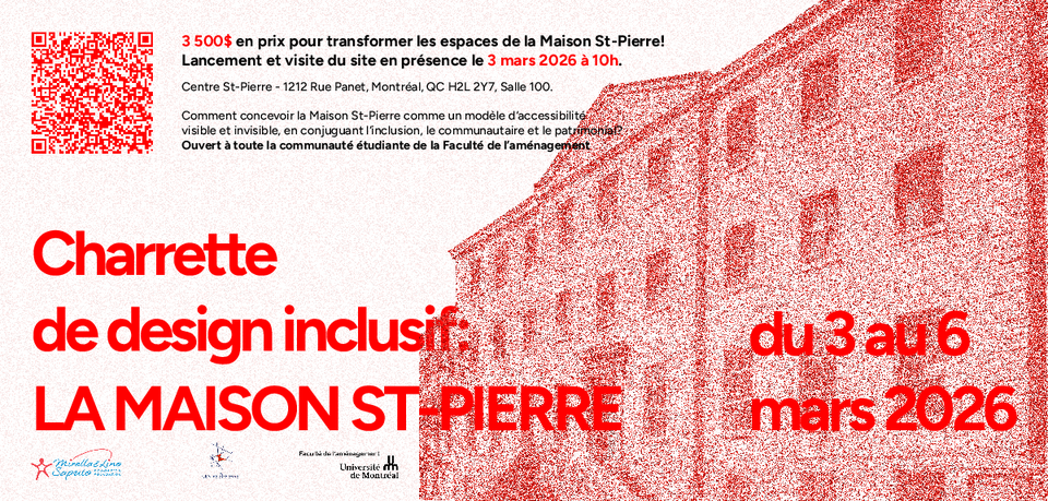 En partenariat avec le Centre St-Pierre et la Maison St-Pierre, cette charrette de design inclusif vous invite à imaginer l’accessibilité universelle, visible et invisible, au cœur d’un bâtiment patrimonial exceptionnel. Pendant quelques jours intensifs et effervescents, contribuez à un projet à fort impact social et courez la chance de remporter l’une des trois bourses totalisant 3 500 $.
