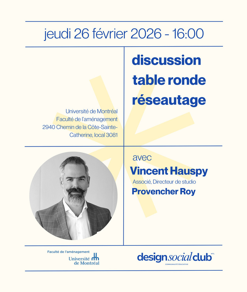 Une conversation ouverte avec Vincent Hauspy (Associé, Directeur de studio - Provencher Roy) autour du design, de son parcours et du milieu.