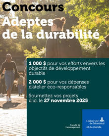 • Au plus tard le 7 novembre 2025 à 23:59, les personnes souhaitant participer au concours doivent faire parvenir à faculteamenagement@umontreal.ca :