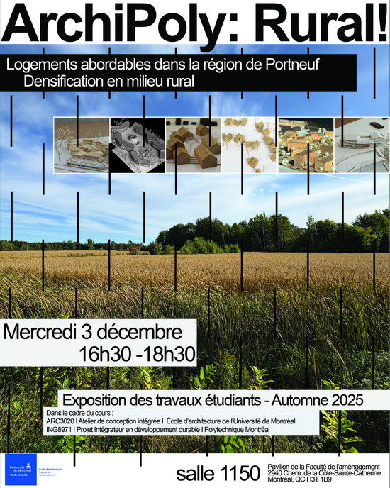 Venez rencontrer les étudiant.e.s de 3ème année du baccalauréat en architecture de l’École d’architecture et de 4ème année de l’école Polytechnique de Montréal dans le cadre du cours ARC3020 et ING8971 « Projet intégrateur en développement durable » pour la présentation des projets de la session automne 2025.
