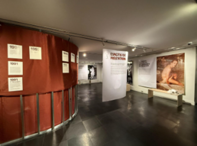 La session a commencé avec la réalisation de deux expositions conçues par des étudiantes à l’automne 2024, accompagnées par la chargée de formation pratiqué Aude Beauchamp-Bourdeau. Dans le cadre d’une collaboration entre le professeur Olivier Vallerand, la compagnie de création théâtrale La messe basse et le Théâtre Duceppe, ces deux expositions accompagnaient la pièce de théâtre Corps fantômes, portant sur l’activisme LGBTQ au tournant des années 1990, dans un contexte d’épidémie du VIH/sida, de meurtres homophobes et de répression policière. Le travail des étudiantes a permis de mettre en valeur des citations d’activistes, des photos de René LeBoeuf et de nombreuses coupures de journaux afin de bien faire comprendre le contexte de la pièce. Un très grand succès, entre autres démontré par de nombreuses photos de l’exposition circulant sur les réseaux sociaux et repartagées par le théâtre, les commentaires positifs reçus par le théâtre à propos de la transformation inédite du foyer ont donné à l’équipe le désir de renouveler l’expérience!