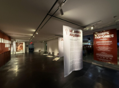 Exposition Corps fantômes, volet 1, à la salle d’exposition de la Place des Arts, septembre 2025, conception par Laury Côté et Marguerite Picard (photo par Olivier Vallerand)