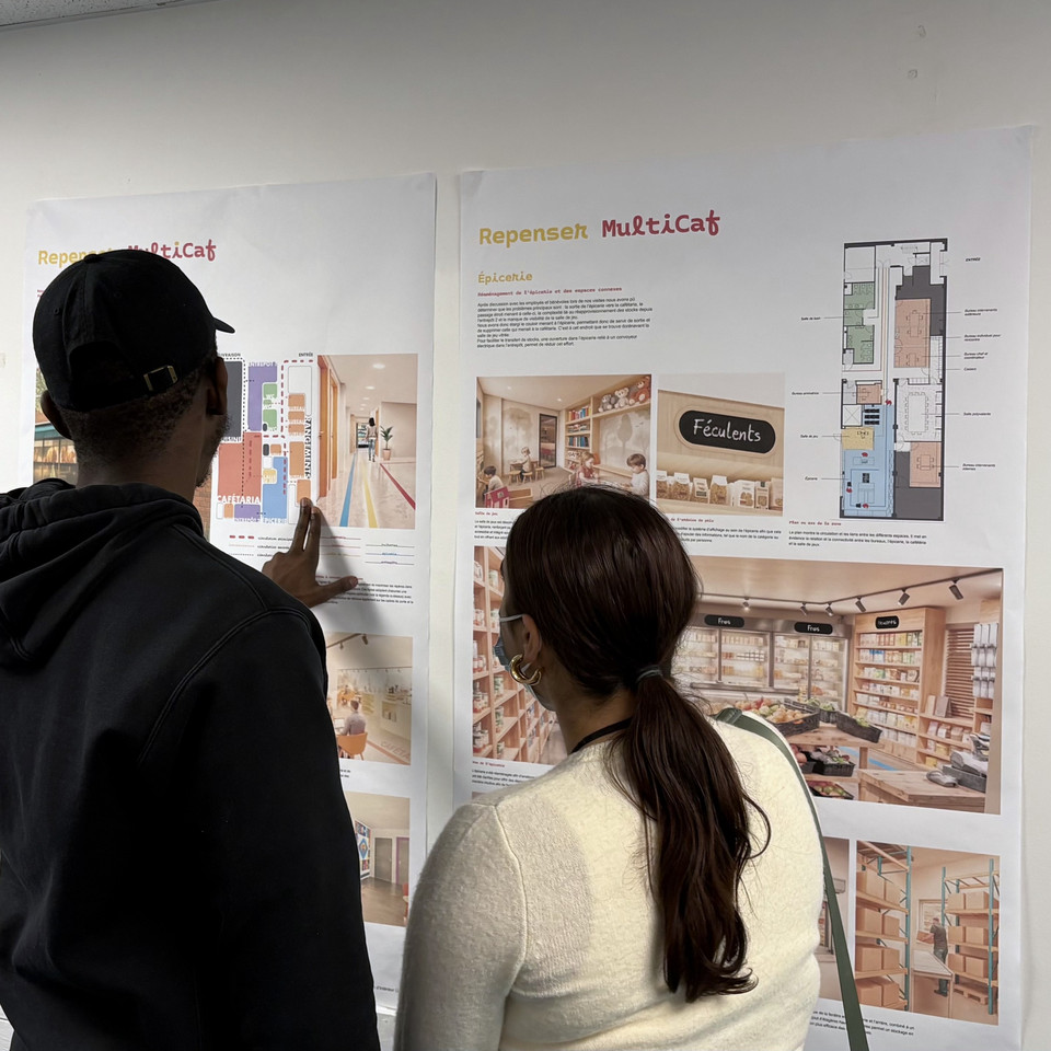 Finalement, au DESS, en deuxième partie de l’atelier-séminaire, le professeur Olivier Vallerand a continué sa collaboration annuelle avec des organismes communautaires en demandant aux étudiant·es d’optimiser l’aménagement des locaux de MultiCaf. Les étudiant·es ont eu à concevoir une activité de conception participative afin de bien comprendre les besoins des employé·es, bénévoles et personnes utilisant les services de cet organisme regroupant cafétéria à faible coût, épicerie solidaire, services de soutien en précarité alimentaire et jardins communautaires. Le défi était d’autant plus grand que les locaux se trouvent dans un sous-sol sans lumière naturelle! En six semaines, les étudiant·es ont bien cerné les enjeux et proposé une série de solutions et stratégies tenant compte des ressources financières limitées de l’organisme et du contexte physique difficile. Plusieurs ont visité à de nombreuses reprises les lieux afin de bien comprendre l’expérience de l’utilisation des services de l’organisme. L’exposition des projets la veille de la fermeture de l’organisme pour la période des fêtes a permis aux étudiant·es de constater encore une fois la pertinence des idées proposées pour cet organisme très fréquenté. Quelques semaines plus tard, la direction est déjà en réflexion sur la mise en place rapide de pistes présentées par différentes équipes.
