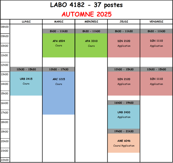 L'accès (en ligne ou en présentiel) aux ordinateurs des laboratoires 3036, 4046, 4056, 4101 et 4182 est réservé aux étudiants inscrits à la Faculté de l'Aménagement.